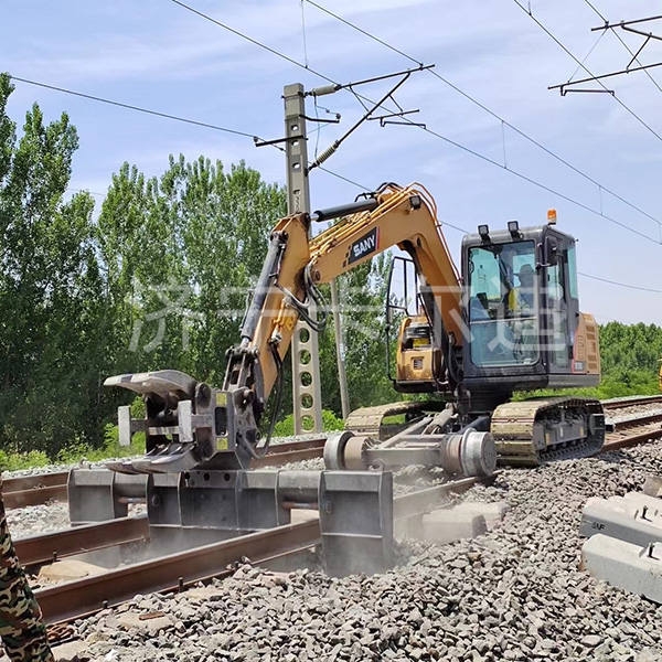 換枕機是一款鐵路養護設備,安裝到挖掘機上,可以更換不同的屬具進行換枕、換軌、道砟清篩等功能,使用挖掘機作底盤,在其前后加裝鋼制導向輪系統及液壓系統,使挖掘機